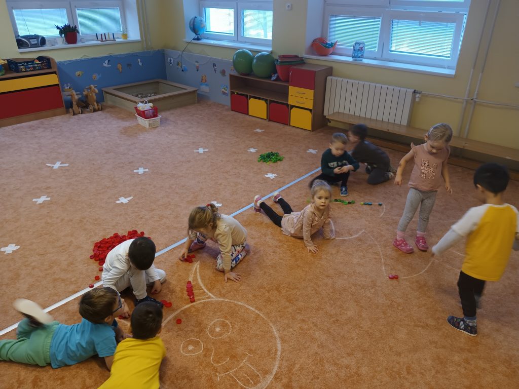 Během pohybových chvilek si děti rozvíjejí lokomoční dovednosti, jako je chůze, běh ve vázaném kruhu, poskoky snožmo (zajíček) nebo podpor dřepmo (kočička). Hrajeme a upevňujeme pohybové hry Kolo, kolo mlýnské, Bublina a Sluníčko se probudilo.