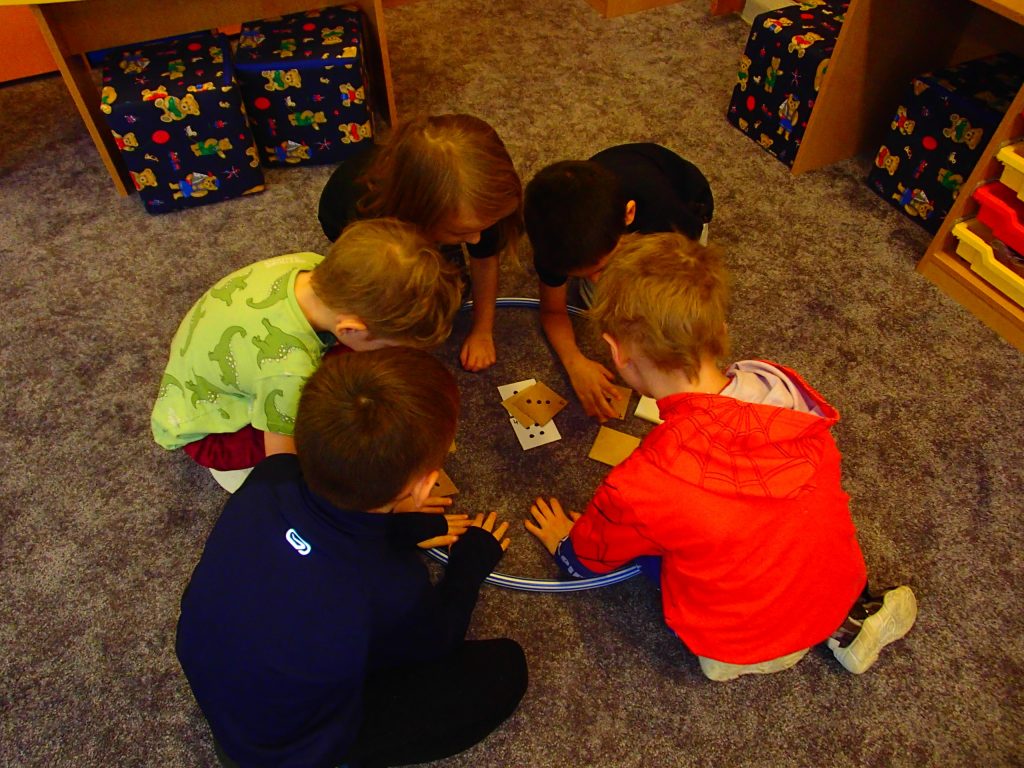 DĚTI SPOLUPRACOVALY VE SKUPINÁCH, POJMENOVÁVALY A POZNÁVALY ZÁKLADNÍ BARVY A TŘÍDILY TVARY DLE VELIKOSTI – OD NEJVĚTŠÍHO PO NEJMENŠÍ ( KRUH, ČTVEREC, TROJÚHELNÍK, OBDÉLNÍK). VE SKUPINÁCH SE DĚTI VŽDY VYSTŘÍDAJÍ NA VŠECH STANOVIŠTÍCH