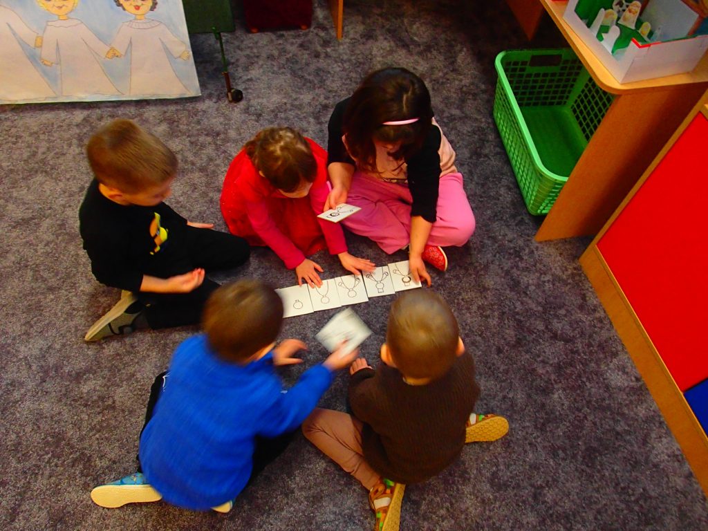 NEJDŘÍVE HLEDALY DĚTI MEZI DVĚMA OBRÁZKY DESET ROZDÍLŮ, NÁSLEDNĚ DOKRESLOVALY KAPROVI ŠUPINKY PODLE DANÉHO ZADÁNÍ, DÁLE KRESLILY OBRÁZEK S VÁNOČNÍM PŘÁNÍM A TAKÉ ZDOBILY SROMEČEK NA PLOŠE POMOCÍ BAREVNÝCH MÍČKŮ, TAKÉ ŘADILY OBRÁZKY PODLE ČASOVÉ POSLOUPNOSTI -JAK SE PEČE CUKROVÍ A ROVNĚŽ POMOCÍ ZAKRESLENÝCH CESTIČEK HLEDALY KOMU PATŘÍ DÁREČEK. NA ZÁVĚR SI PROHLÉDLY KNIHY Z NABÍDKY.