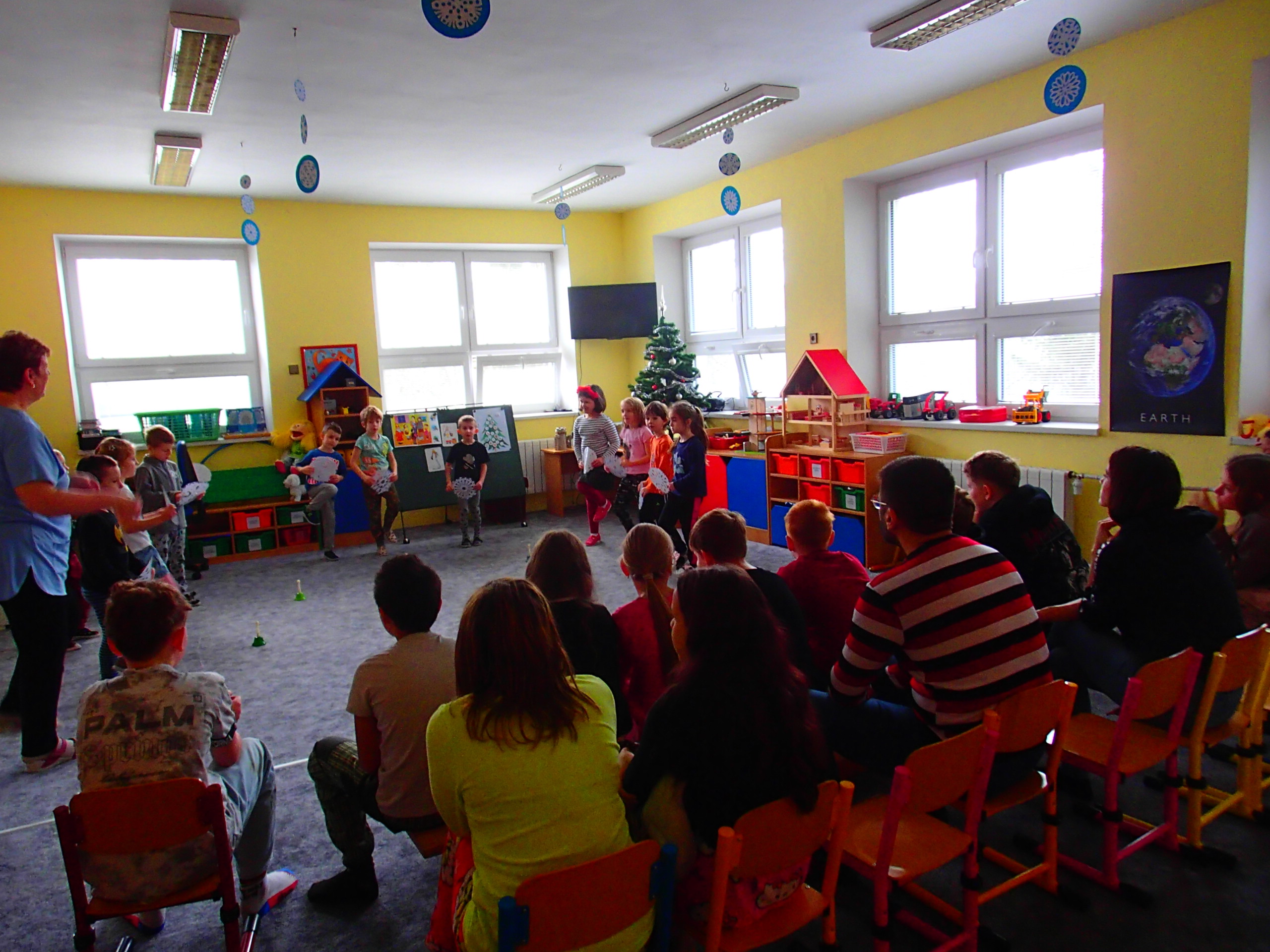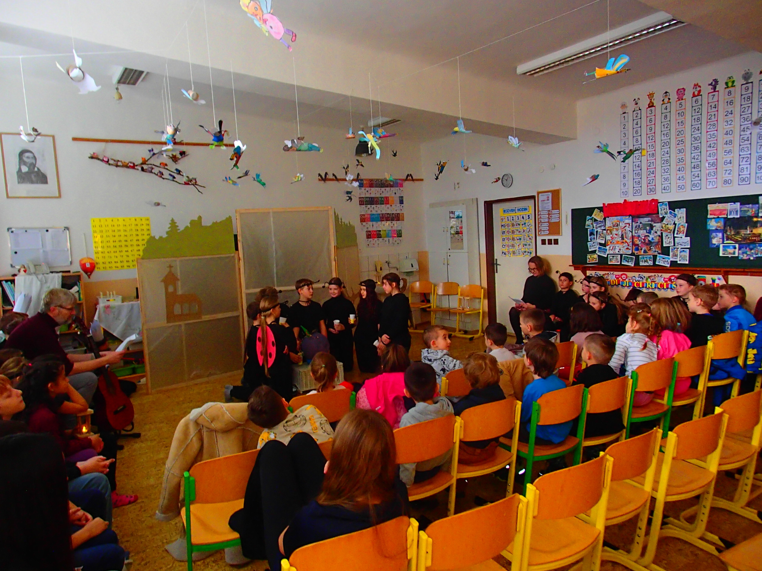 V RÁMCI SPOLUPRÁCE SE ZÁKLADNÍ ŠKOLOU, SE DĚTI Z MATEŘSKÉ ŠKLOLY BYLY PODÍVAT V ZÁKLADNÍ ŠKOLE NA PŘEDSTAVENÍ ŠKOLÁKŮ „BROUČCI“. POZVALI JE TAM SOUROZENCI A NA OPLÁTKU ZASE PŘIŠLI ŠKOLÁCI DO ŠKOLKY, PODÍVAT SE NA VYSTOUPENÍ PŘEDŠKOLÁKŮ, KTERÉ DĚTI ZE ŠKOLKY NATRÉNOVALY NA VYSTOUPENÍ PRO RODIČE NA VÁNOČNÍ POSEZENÍ.