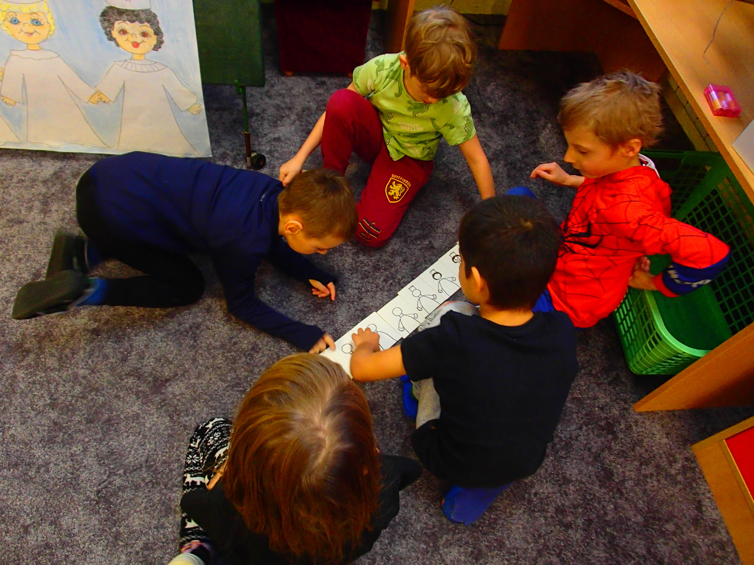 V PRŮBĚHU POSLECHU ČTENÉ POHÁDKY “ O PEJSKOVI A KOČIČCE, JAK SLAVILY VÁNOCE“ PLNILY DĚTI RŮZNÉ UKOLY. KTERÉ BYLY PRO NĚ NACHYSTÁNY.
