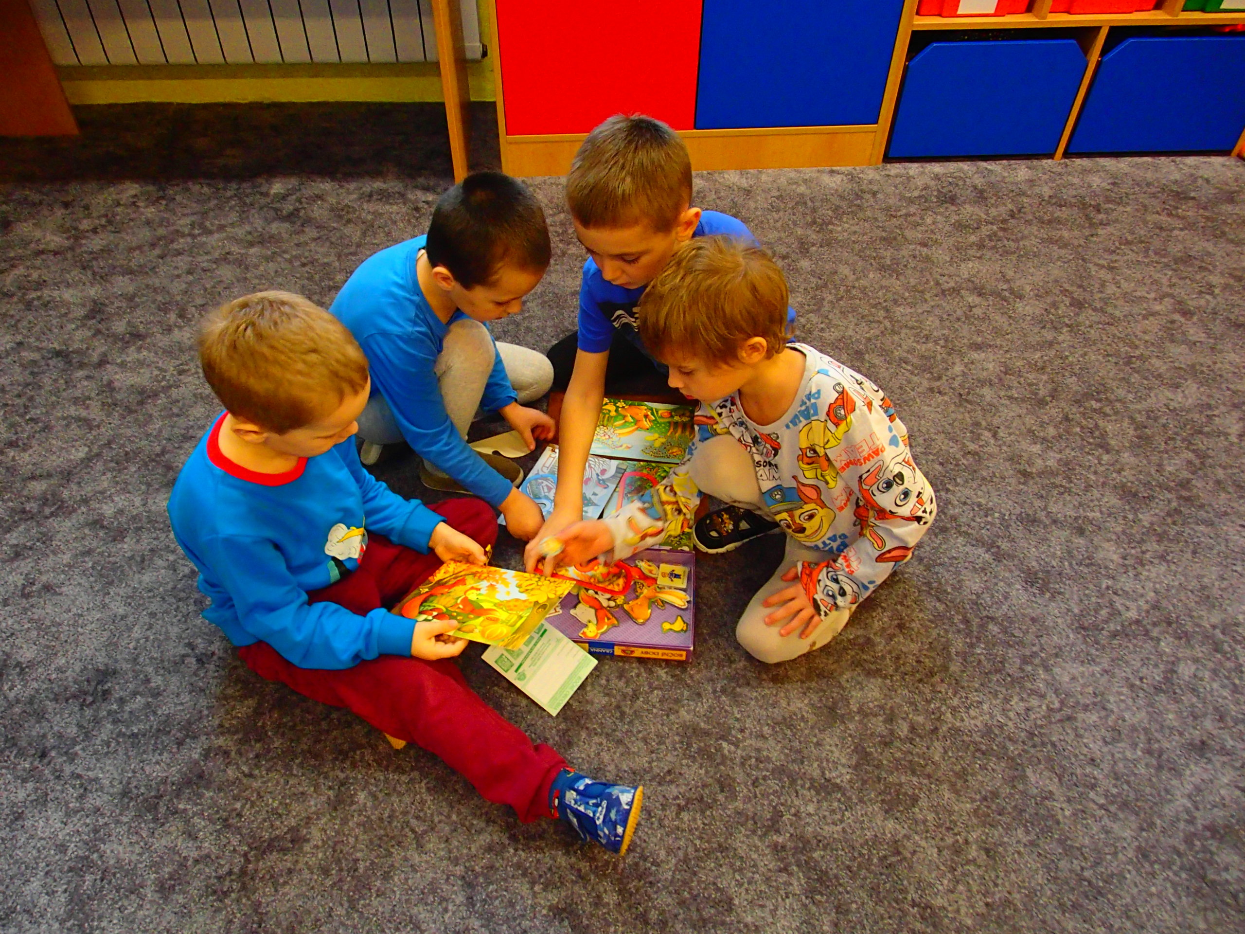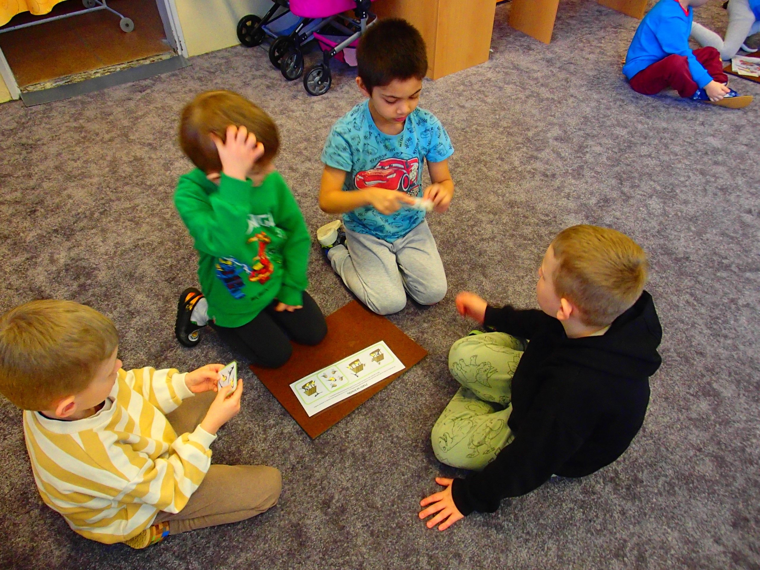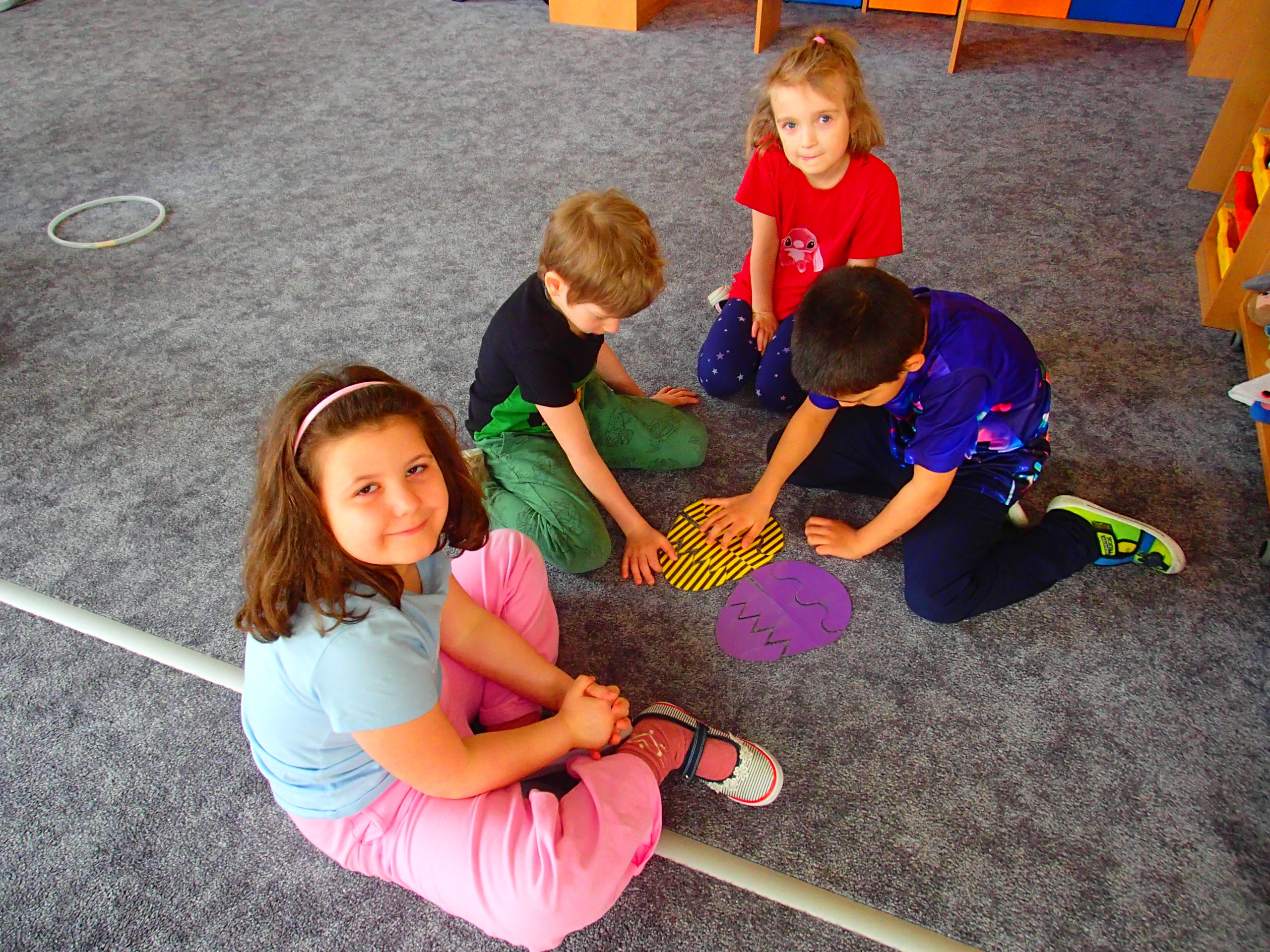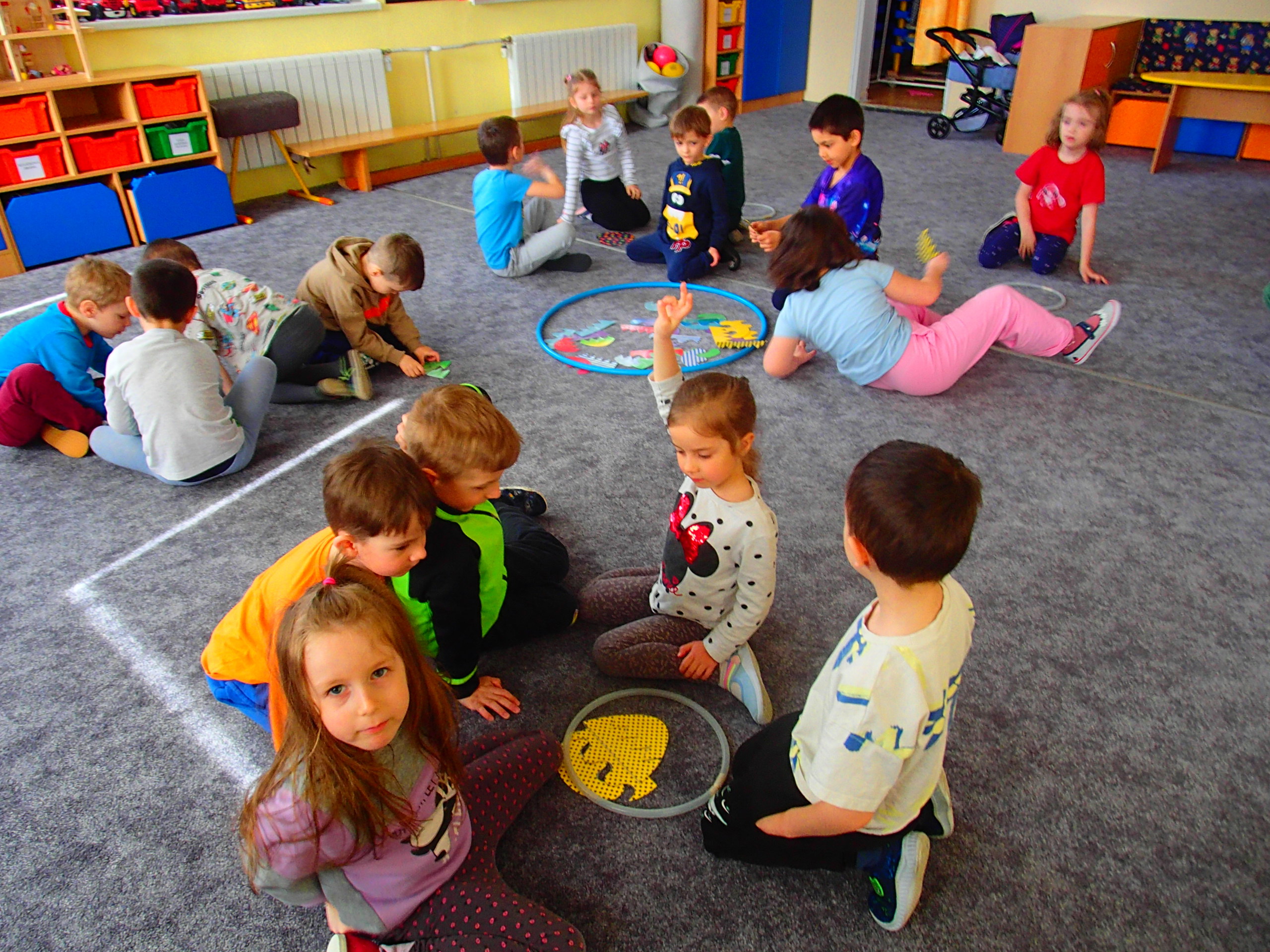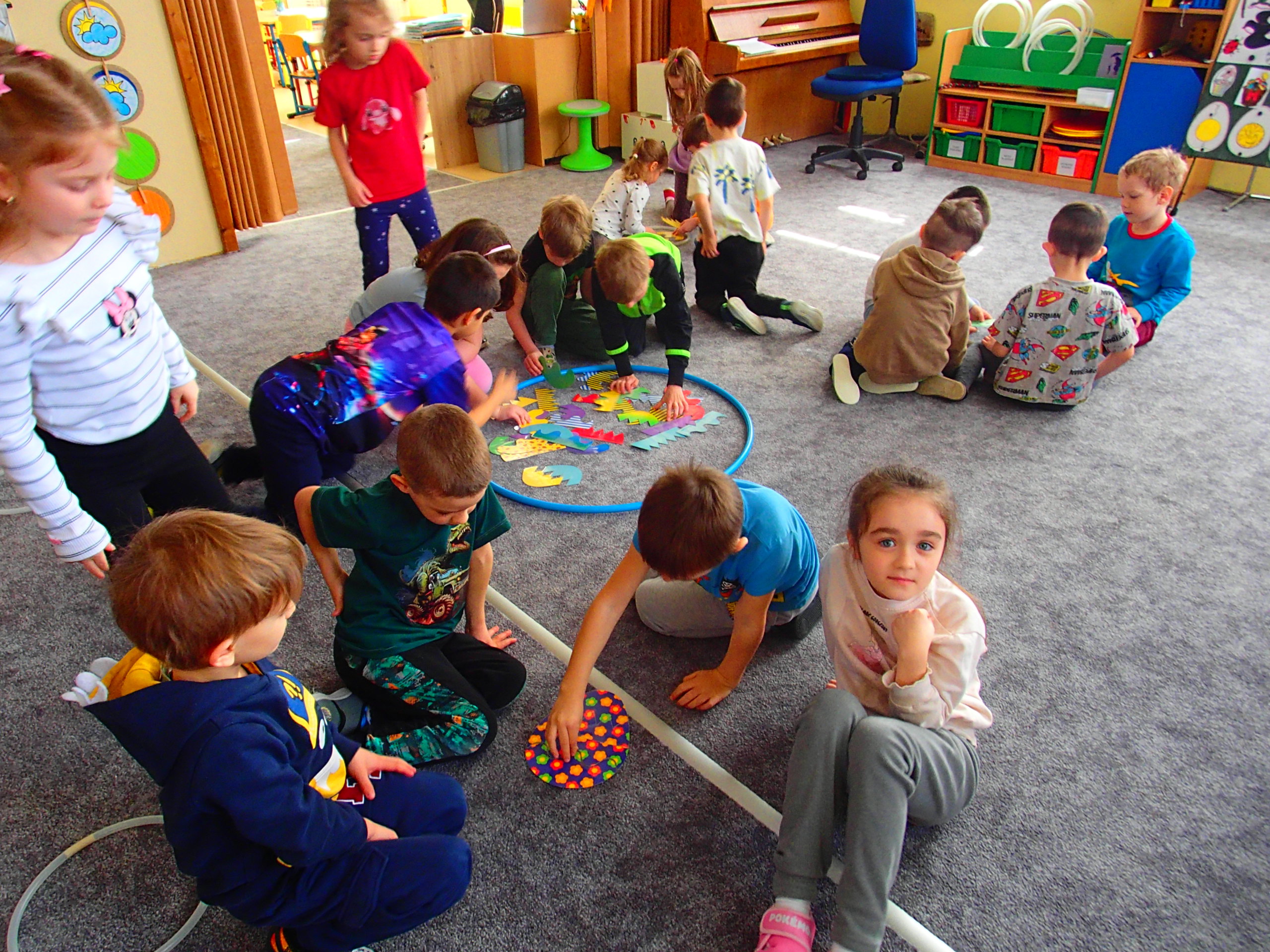 DĚTI SPOLUPRACOVALY VE SKUPINÁCH, POJMENOVÁVALY A POZNÁVALY ZÁKLADNÍ BARVY A TŘÍDILY TVARY DLE VELIKOSTI – OD NEJVĚTŠÍHO PO NEJMENŠÍ ( KRUH, ČTVEREC, TROJÚHELNÍK, OBDÉLNÍK). VE SKUPINÁCH SE DĚTI VŽDY VYSTŘÍDAJÍ NA VŠECH STANOVIŠTÍCH