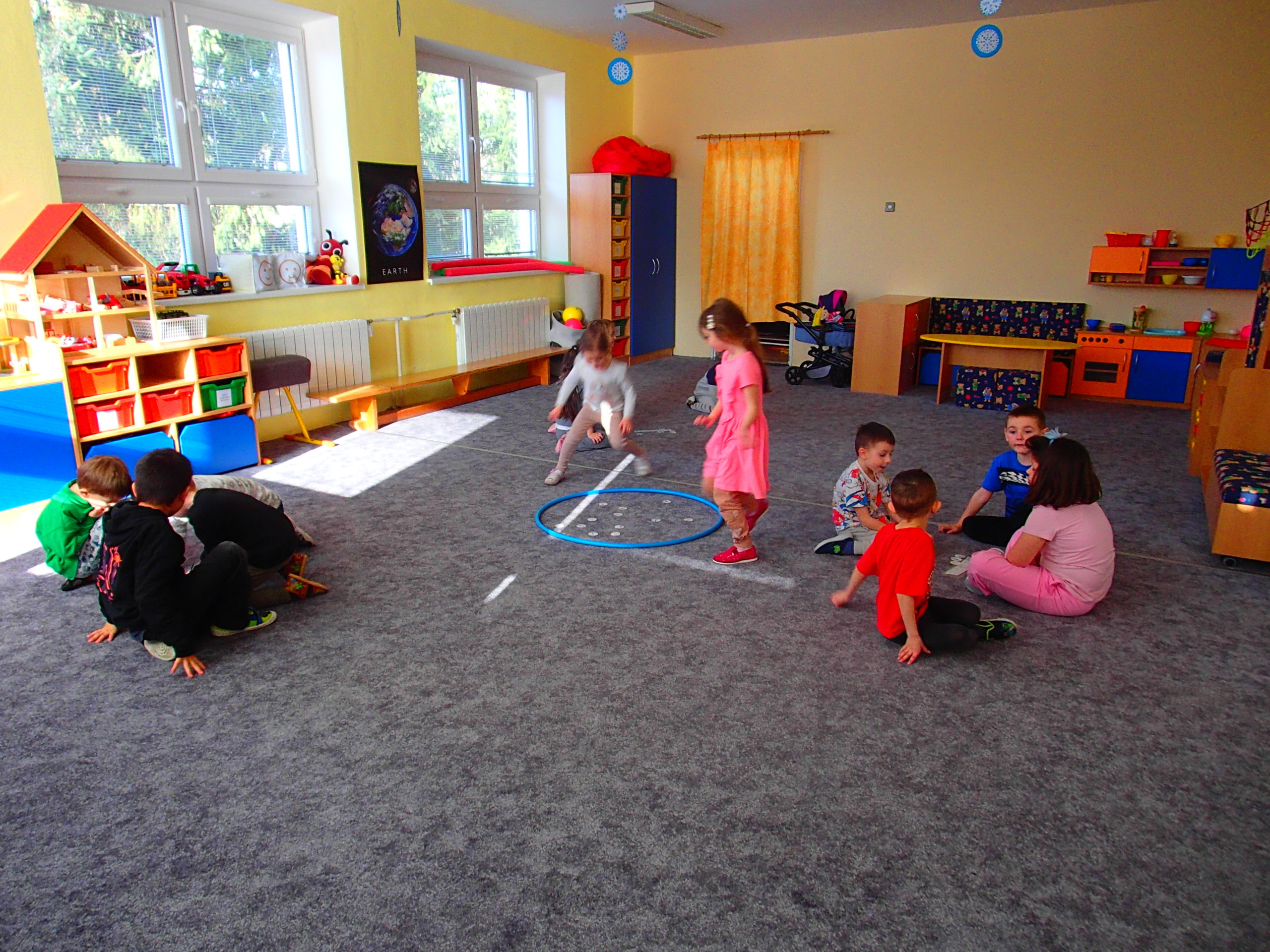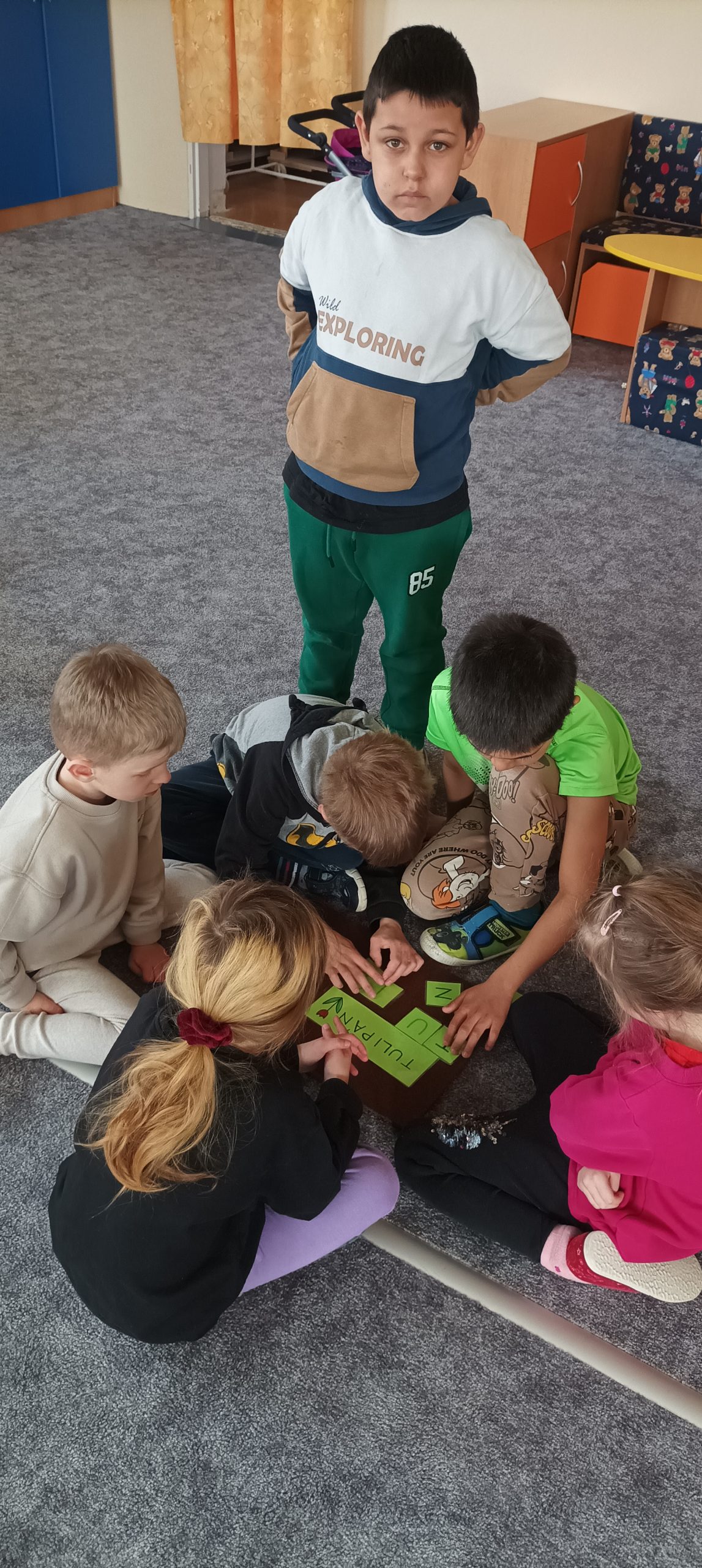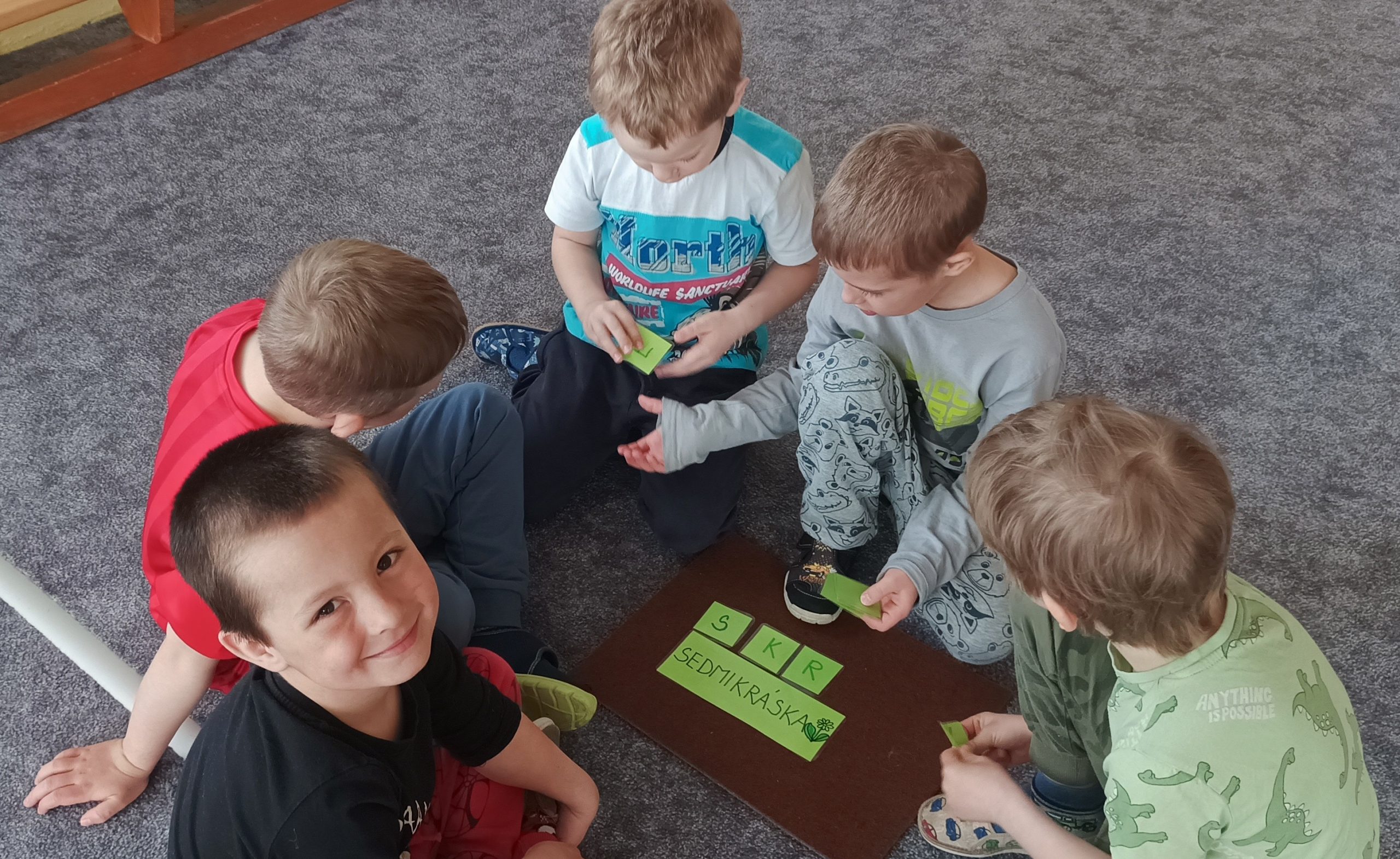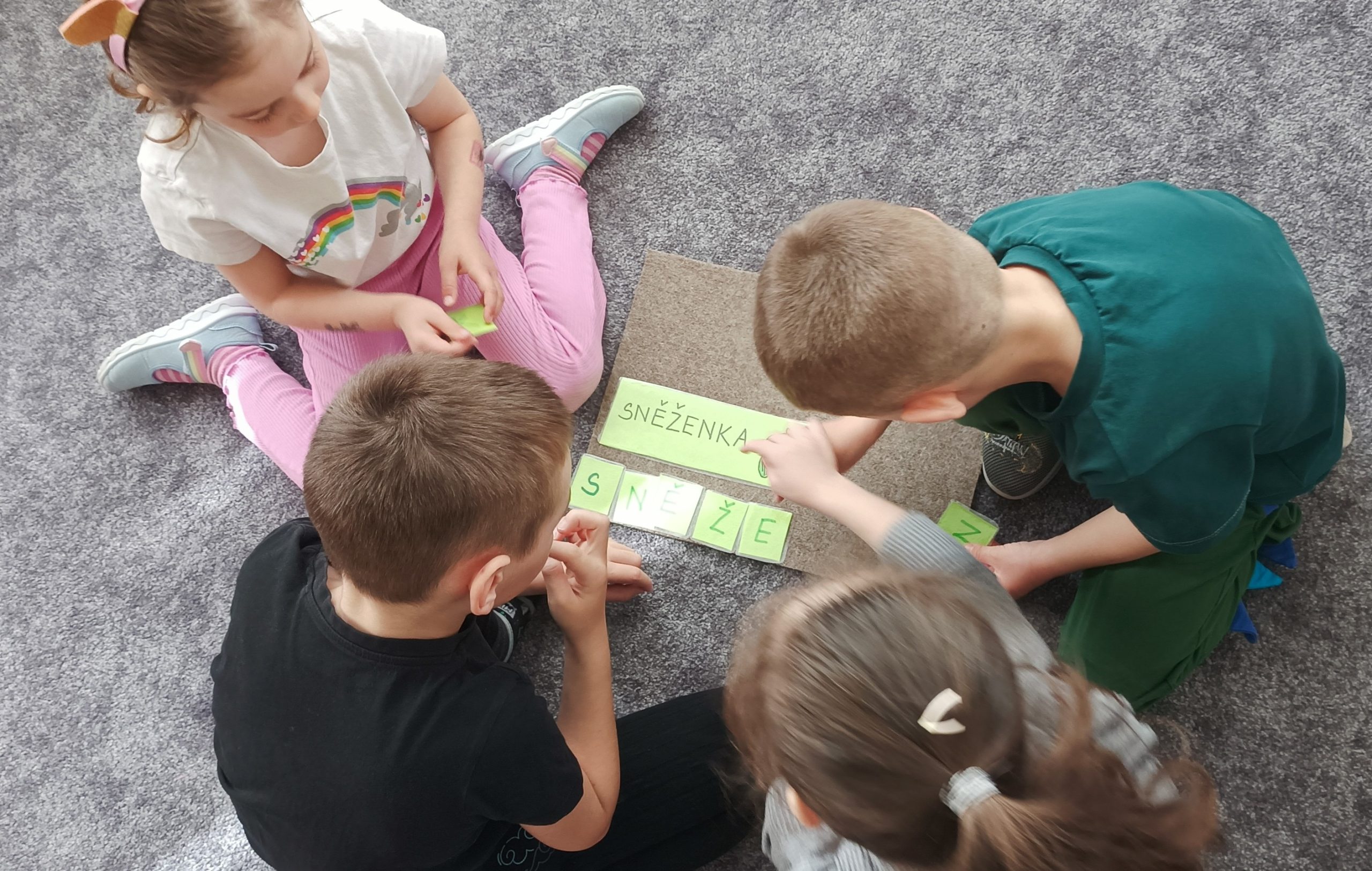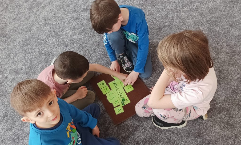 BĚHEM DIDAKTICKÉ HRY „ZAHRÁDKA“ DĚTI VYHLEDÁVALY TVARY PÍSMEN PODLE PŘEDLOHY, KTERÉ NÁSLEDNĚ ŘADILY DO ŘÁDKU. POZNÁVALY A POJMENOVÁVALY JARNÍ KVĚTINY, VYTKESKÁVALY A ROZKLÁDALY SLOVA NA SLABIKY A NÁSLEDNĚ NA PÍSMENA