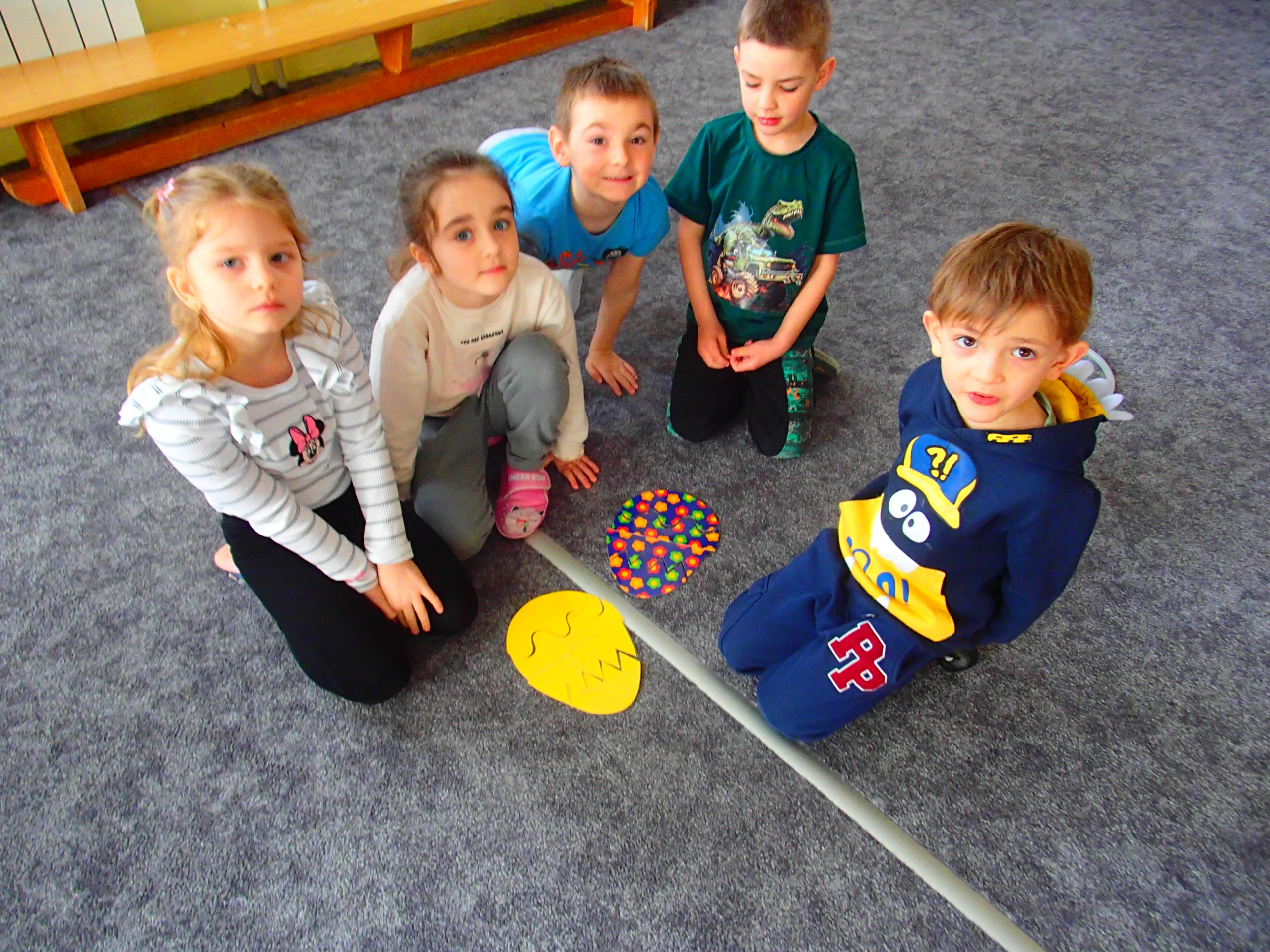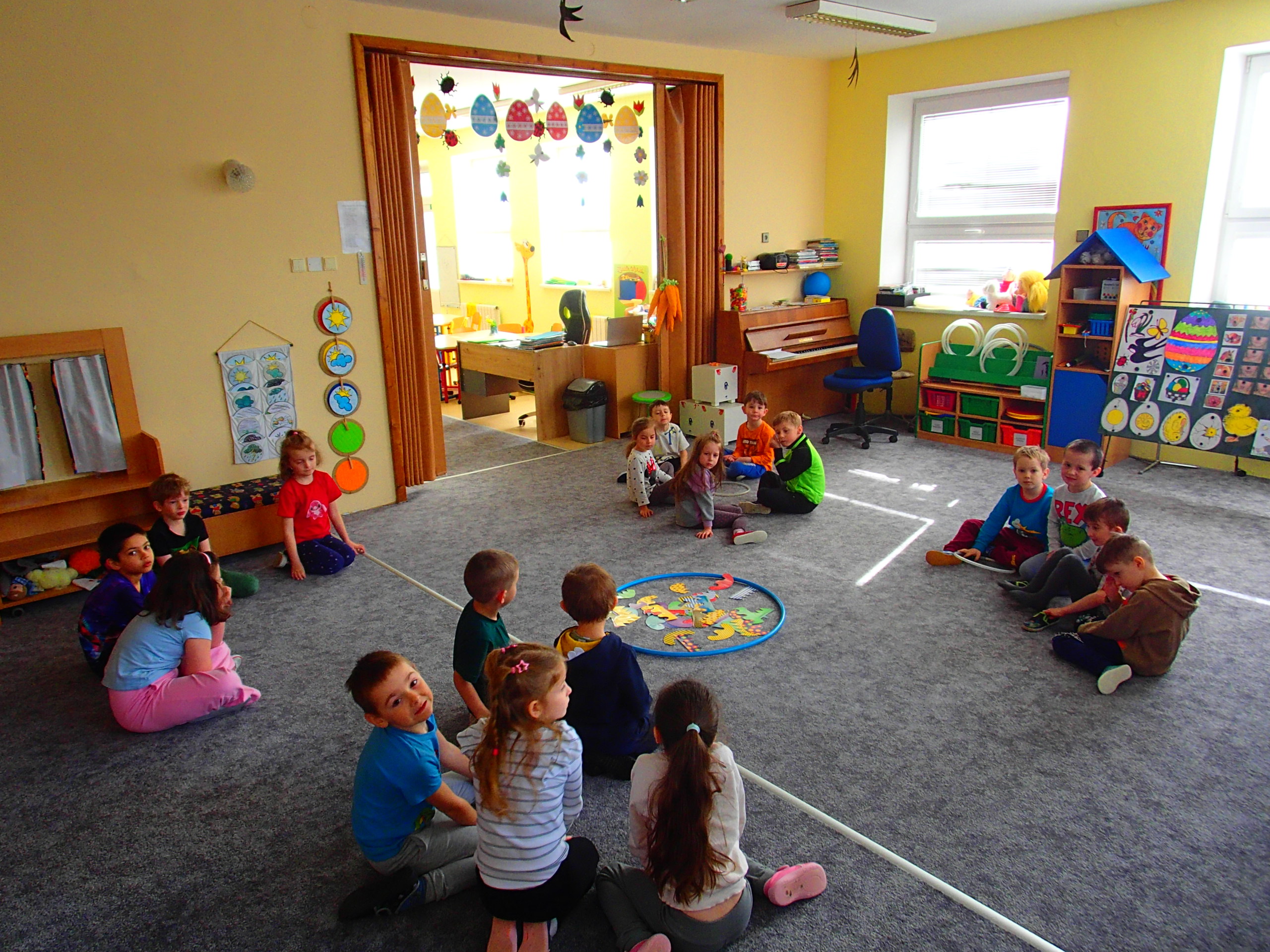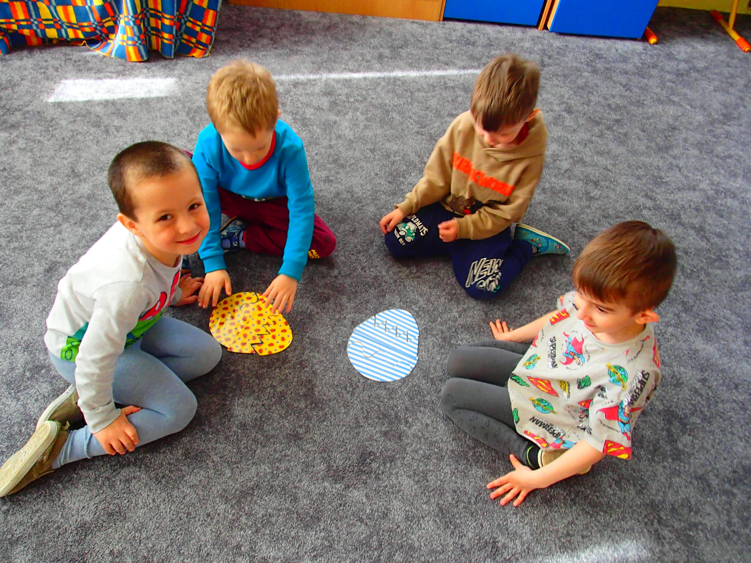 DĚTI SKLÁDALY ČÁSTI V CELEK- VELIKONOČNÍ VAJÍČKA-PUZZLE, KDY VYHLEDÁVALY STEJNÝ MOTIV ZADANÉHO VAJÍČKA (KVĚTINY, PROUŽKY, BAREVNÝ MOTIV, PUNTÍKY…). VE SKUPINĚ VRSTEVNÍKŮ BYLY VEDENY KE SPOLUPRÁCI A VZÁJEMNÉ DOMLUVĚ.