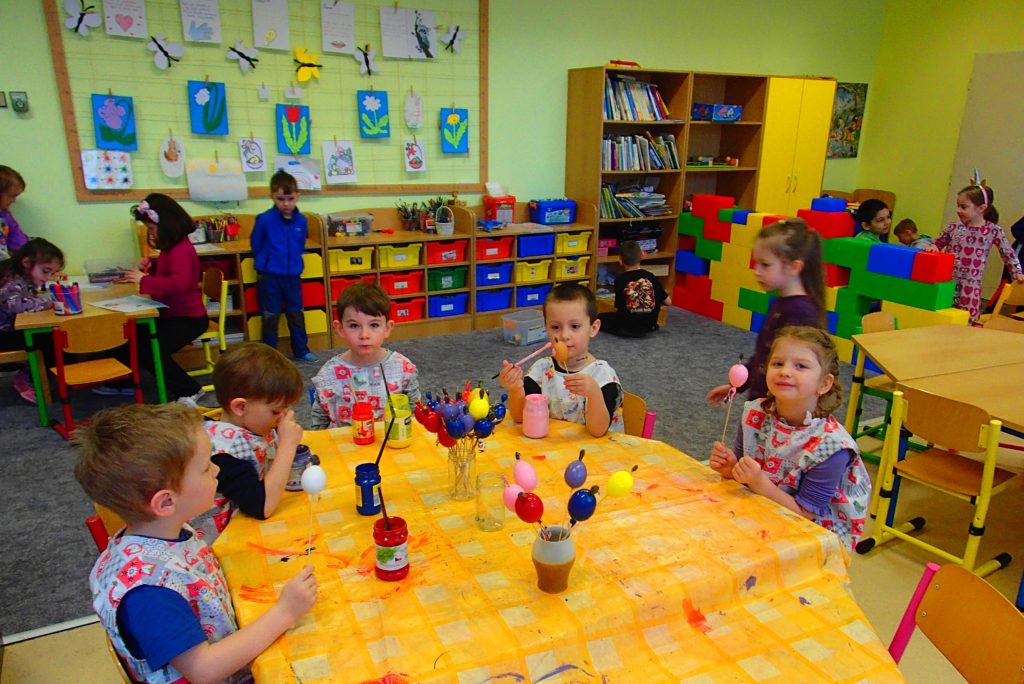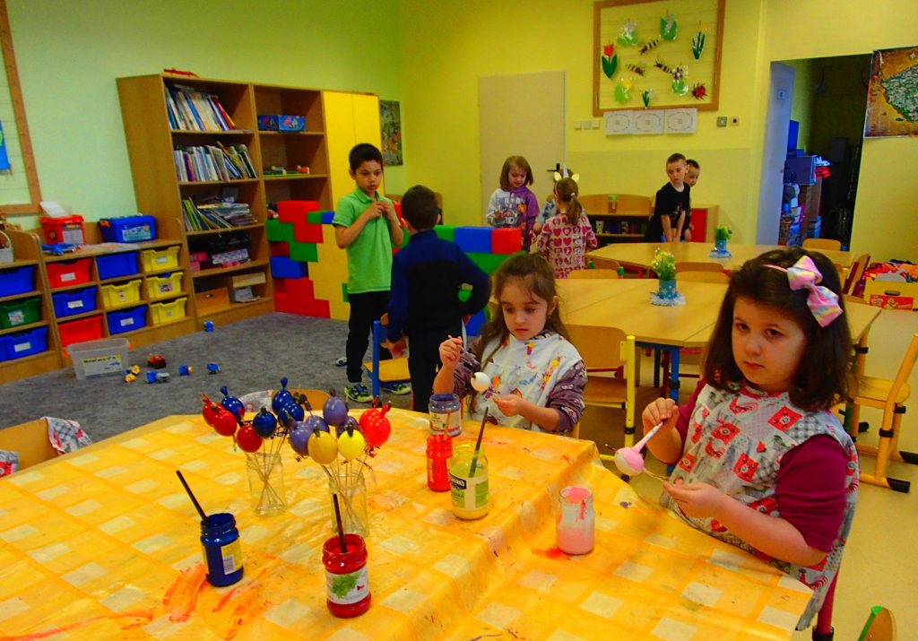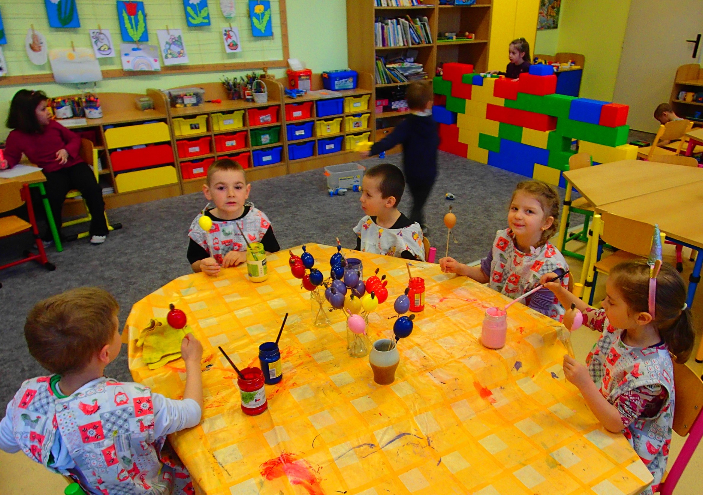 PŘI MALOVÁNÍ VAJÍČEK SE SNAŽILY DĚTI DODRŽOVAT SPRÁVNÝ POSTUP PŘI PRÁCI S BARVOU A ŠTĚTCEM. POSILOVALY TRPĚLIVOST A PEČLIVOST PŘI PRÁCI S NETRADIČNÍM MATERIÁLEM. UPEVŇOVÁNÍ VELIKONOČNÍCH TRADIC A ZVYKŮ – SVÁTKY JARA. UČILY SE PÍSNĚ K TÉMATU.